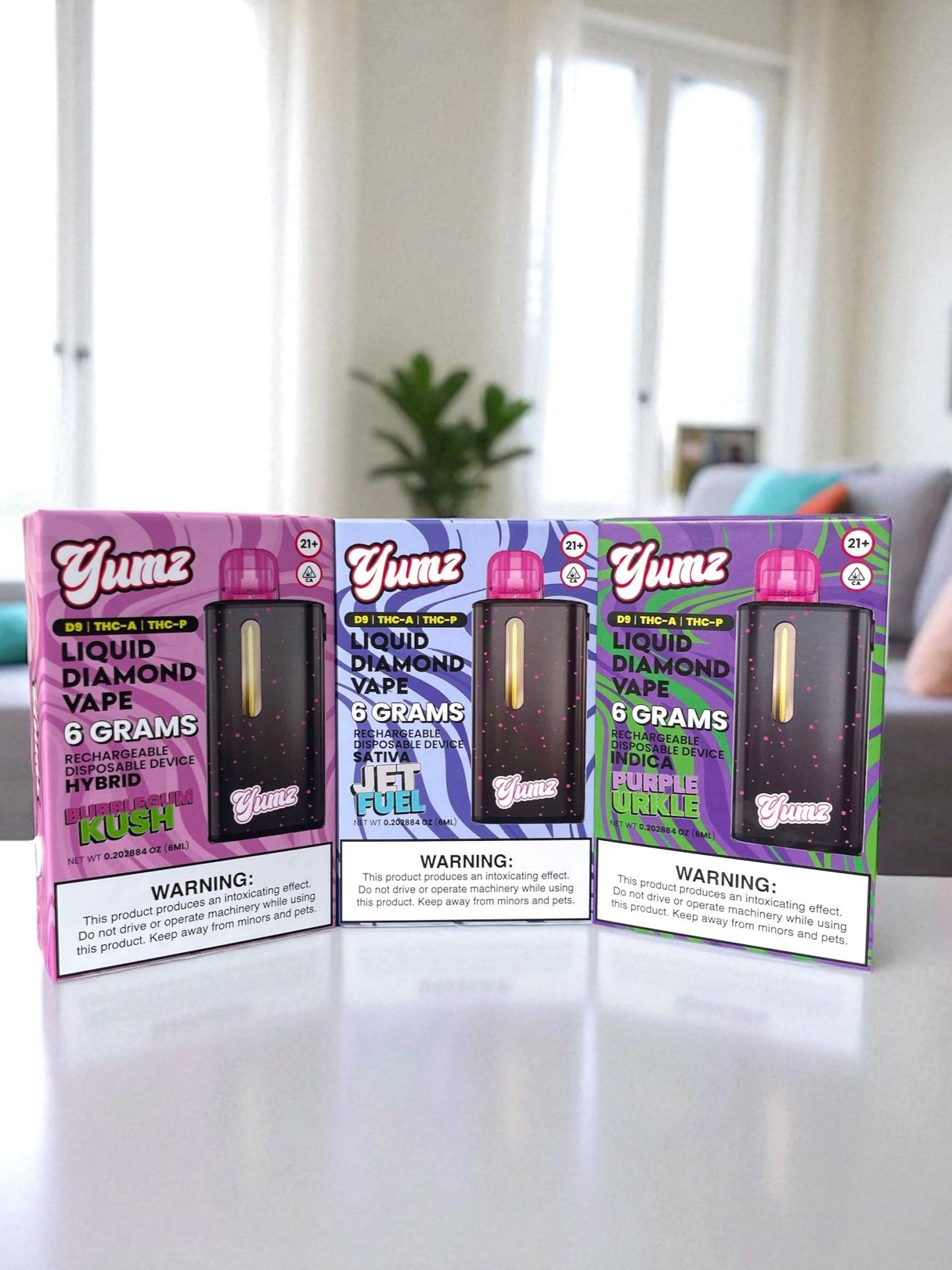 Introducing the Yumz 6 Gram Disposable Vape Bundle, a revolutionary breakthrough in vaping technology that sets a new standard for convenience, potency, and innovation. As the world's first 6-gram disposable vape with a digital screen, Yumz offers an unparalleled experience for both novice and seasoned users. With a unique blend of three cannabinoids—D9, THC-A, and THC-P—this device delivers a balanced and robust effect that elevates your vaping journey to new heights.