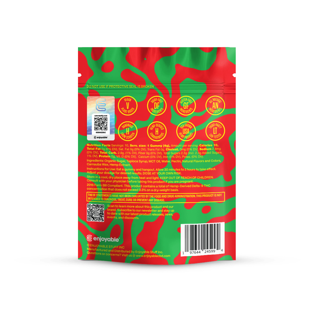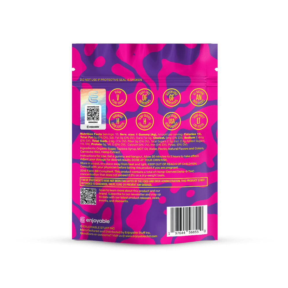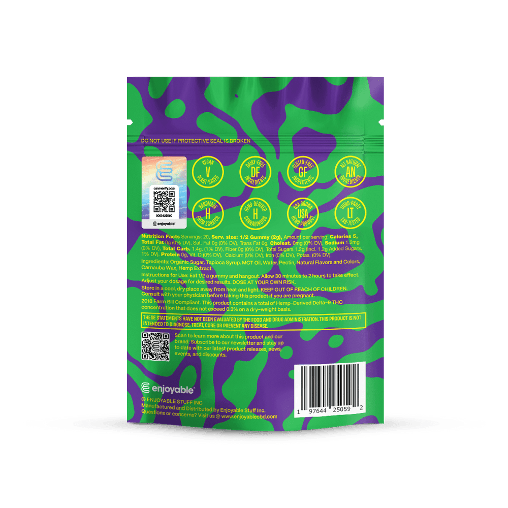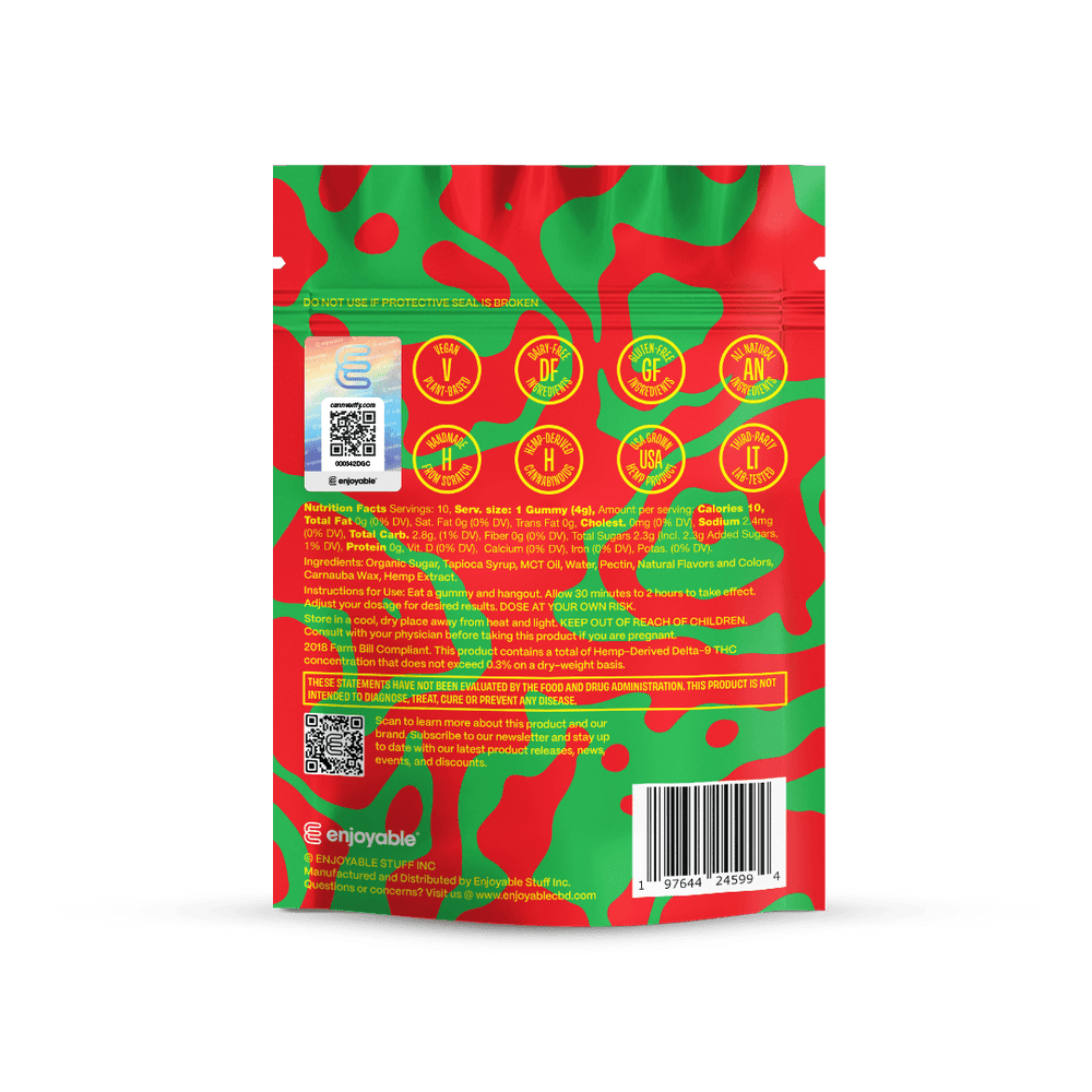 Ingredients | Organic Sugar, Tapioca Syrup, MCT Oil, Water, Pectin, Natural Flavors, Colors, Carnauba Wax, Hemp Extract |