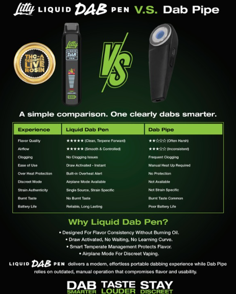 Why Choose the Litty Liquid Dab Pen? Unlike traditional dab pipes that require manual heating and often deliver harsh, inconsistent hits, the Litty Liquid Dab Pen uses Smart Vape Technology to manage temperature automatically. The result is smooth airflow, instant draw activation, and 100% flavor retention.